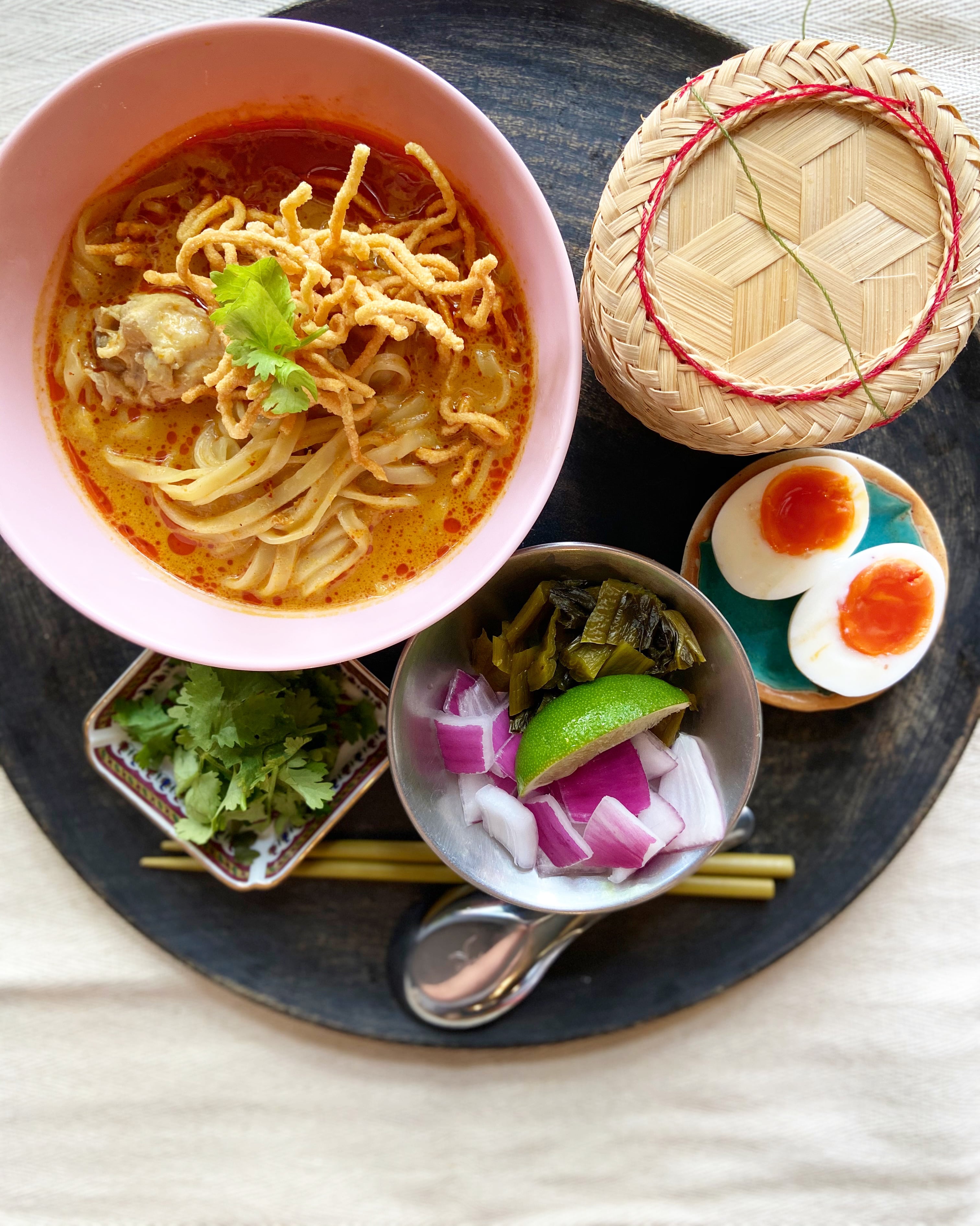 カオソーイスープとオリジナルの麺のセットです。自家製エビラー油とライム汁が付きます。